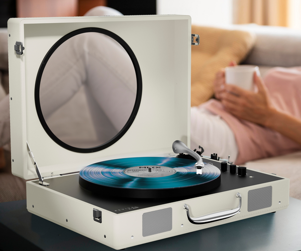 Portable Case with Viewing Window: Encased in a sleek, retro-inspired portable design with a convenient viewing window, the Mixx Revival 65 is easy to transport and adds a stylish touch to any room.